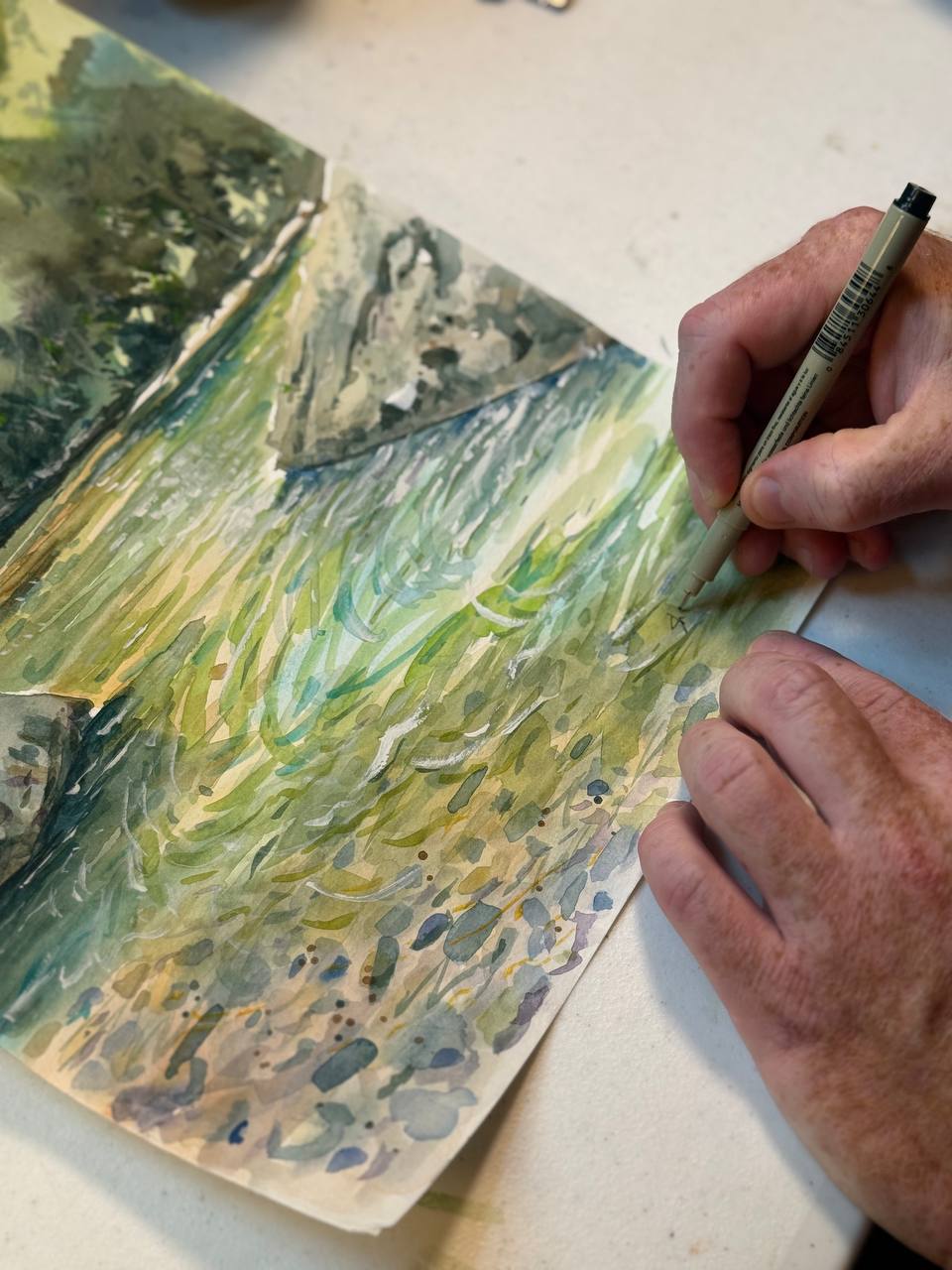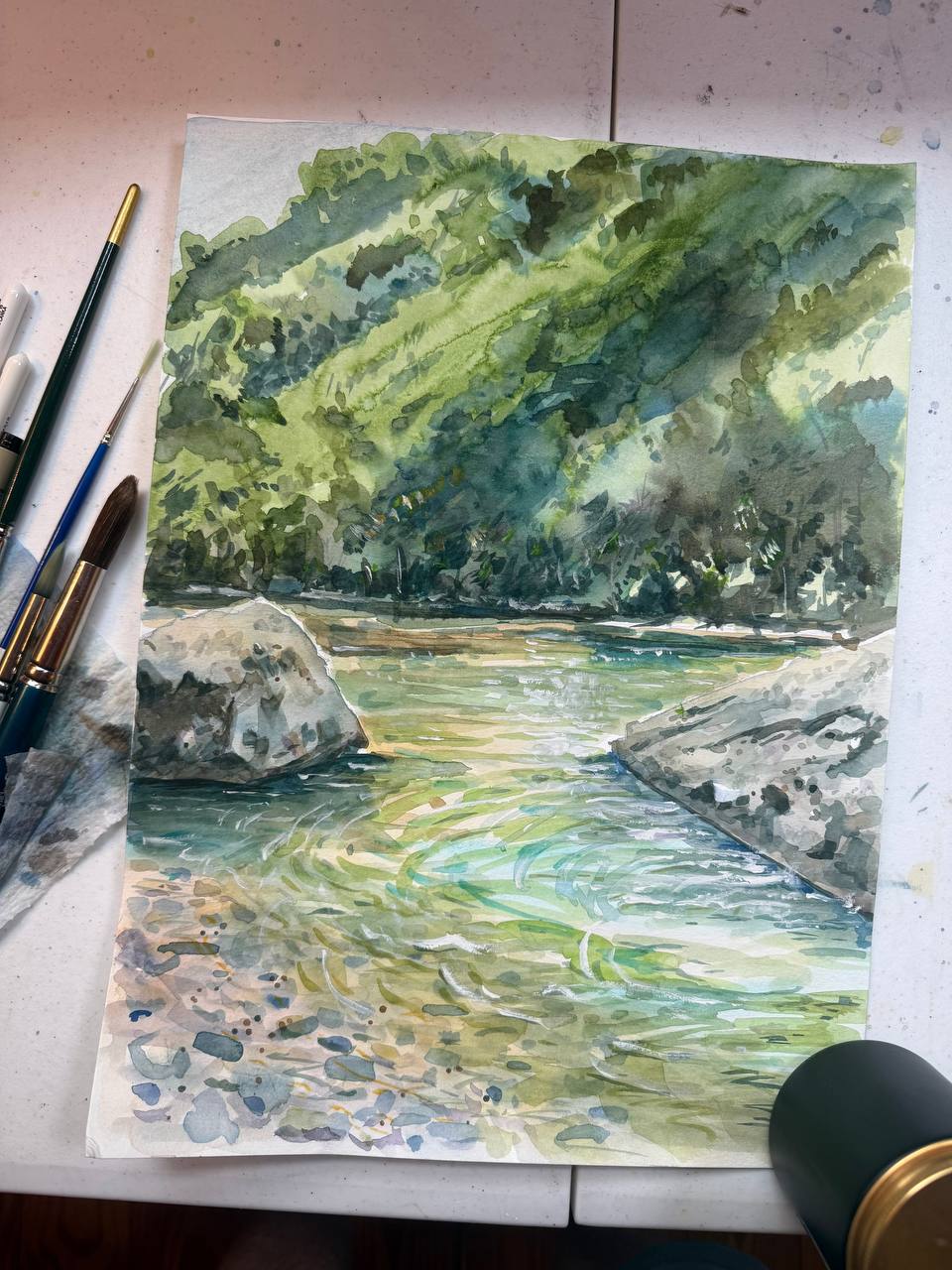Painted by hand on 140lb Canson watercolor paper and signed by the artist, this 11x15 inch piece invites you into a quiet place where the only sound is the rush of water and rustling leaves. Gentle washes and layered pigments create depth and movement, drawing the viewer right into the cool shade of the woods and water pools.