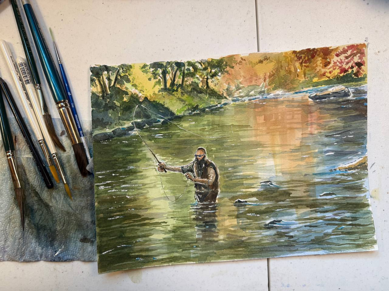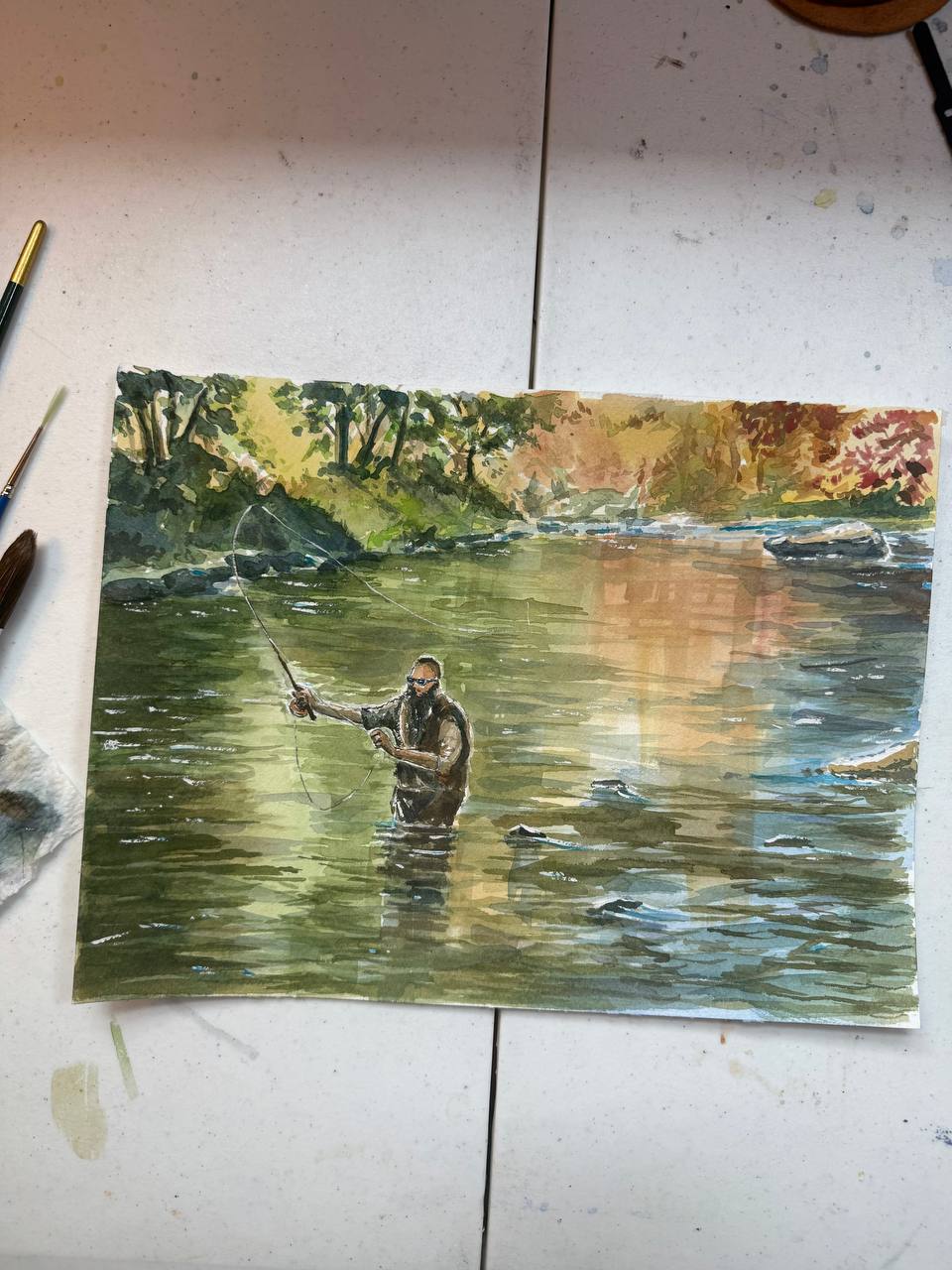 Painted on 9x12 inch 140lb Canson watercolor paper and signed by the artist, this piece brings to life a lone fisherman standing mid-stream, surrounded by cool, dappled light and the hush of the forest. Subtle layers and flowing brushwork give movement to the water and air, while the figure remains grounded in calm intention.