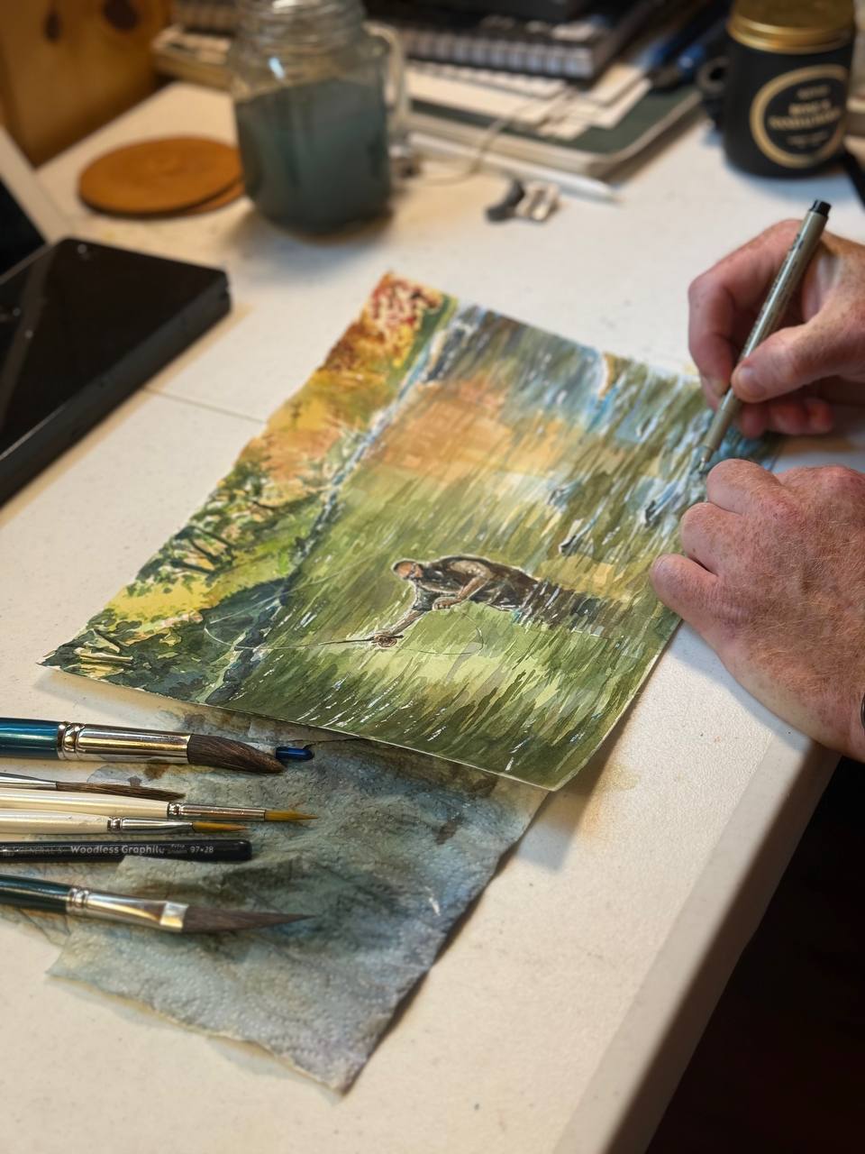 A quiet stream, a well-timed cast, and a moment of total focus—this original watercolor captures the timeless ritual of fly fishing in the solitude of nature.